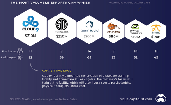 根据2018年福布斯的电竞企业估值排名,排在首位的Cloud9近期宣布在洛杉矶设立规模可观的训练基地,而竞技心理学家和诊疗师等常规体育项目中的人员配置也逐渐成为电竞俱乐部的“必备”配置。