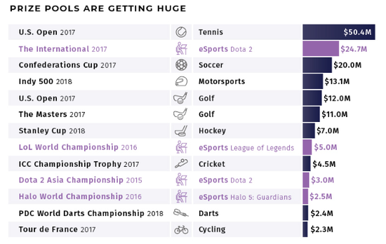 与观众数量相辅相成的是吸引眼球的高额奖金。作为体育行业的后起之秀,电竞比赛的奖金已经能够和网球和足球顶级赛事相提并论。