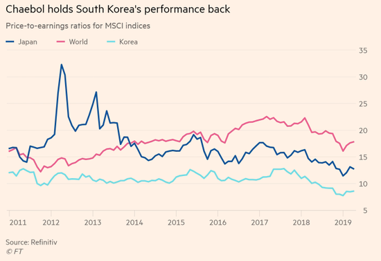 韩国最大的10家财阀占韩国综合股价指数市值的一半以上,至少占成份股公司净利润的70%。但它们与政治的暧昧关系、复杂的公司结构以及相当低的股息,引起了投资者的愤怒。