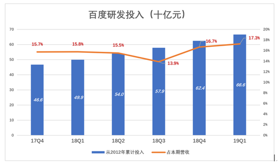 研发费用较2018年Q1又涨了9亿,达42亿,占营收的17.3%,创历史新高。2012年以来,百度已累计投入研发费用666亿(大约100亿美元)。