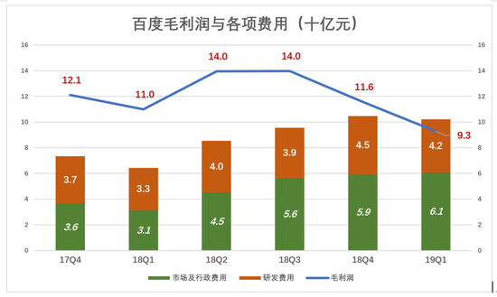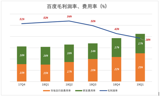 将图中数据全换成百分数,看得更明白:百度毛利润率从2018年Q2的54%下降到2019年Q1的38%。同期,市场及行政、研发费率分别上涨8个百分点和1个百分点。
