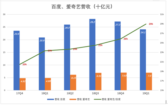 爱奇艺在百度营收中的权重仍在持续上升。2018年Q1,爱奇艺营收48.6亿,相当于百度的23%;2019年Q1,爱奇艺70亿营收已是百度的29%,一年涨了6个百分点。