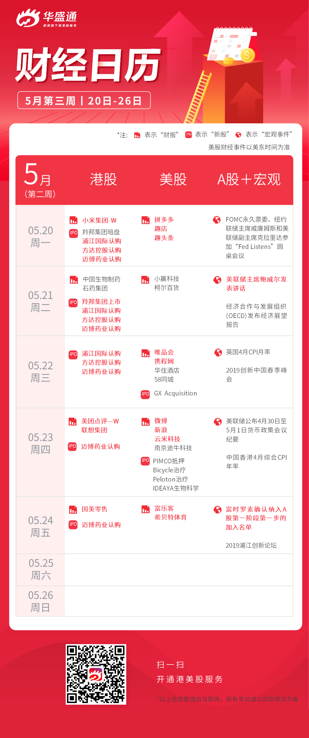以上即为本周港美股、A股及宏观资讯一览,祝新的一周投资顺利~点击“日历”专区,了解本周更多财经大事