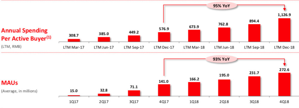 上图为拼多多单位活跃消费者年度花费,增长可能是客单价提升,也可能是订单数量增加;下图是拼多多MAU季度变化