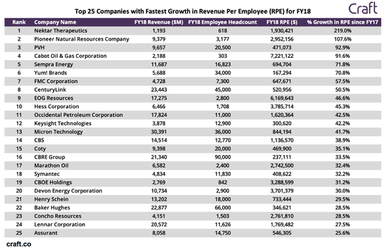 除了看存量,更要关注代表趋势的增长速度。2018财年,标普500成分股公司在人均创收这一项指标上增长最快的是生物制药公司Nektar Therapeutics,同比增长219%。另外,能源公司在增速上也表现抢眼。有8家公司的增速进入前25名。
