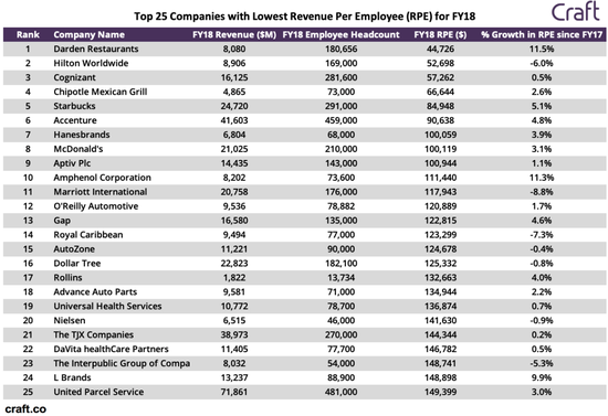 不仅要向前看,也要向后看。2018财年,标普500成分股公司在人均创收上最少的是餐饮企业Darden Restaurants,只有4.5万美元,即便较上一年已经增长了11.5%。