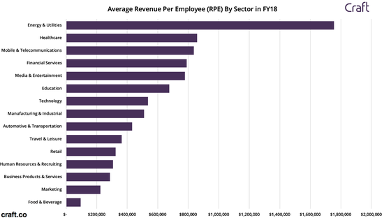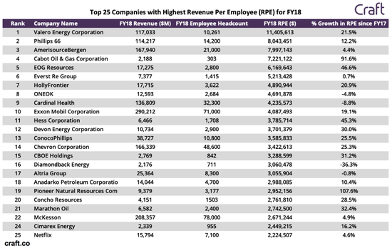 能源公司在人均创收上的优势非常明显。所有标普500成分股公司中,有17家能源公司挤进了人均创收前25名。其中包括排在第一位的北美最大炼油企业瓦莱罗能源公司(2018财年人均创收超过1000千万美元)。