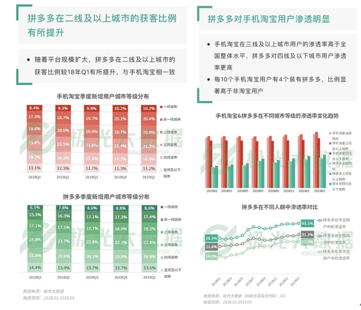 极光大数据的最新报告显示,截至2019年第一季度,拼多多新增用户44.2%来自二线及以上城市,一二线城市用户占比持续上升。此外,拼多多的用户渗透率持续攀升,对于淘宝用户的渗透率已达40.1%。
