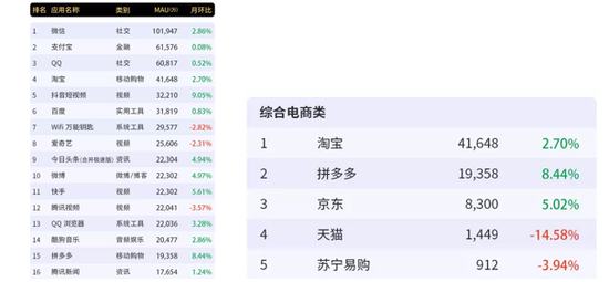 在综合类电商行业内,拼多多月活用户规模位列第二,月环比增速继续保持第一。