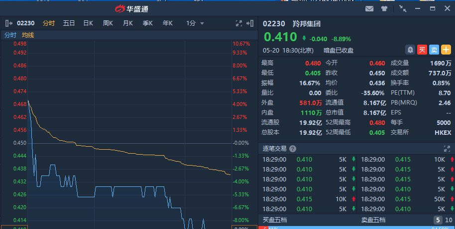 羚邦集团暗盘收报0.41港元,较发行价0.45港元跌8.89%,每手蚀200港元,成交额737万港元,总市值为8.167亿港元。