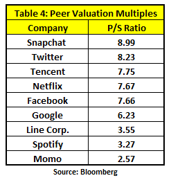 下图可见,同业的市销率从Spotify的3.27到推特的8.23倍不等,但是其中的高市销率平台的活跃用户数量都没有达到10亿。因此笔者认为Instagram的市销率在高端保守位置,介于7倍和8倍之间。预计今年Instagram的广告收入将达到140亿美元,以此计算,其估值约为980-1120亿美元,与彭博估计的一千亿美元基本一致。