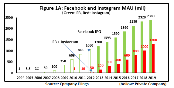 Instagram在2018年月活数量达到10亿,用户增长走势和2004-2012年的Facebook相同。不同的地方在于当时Facebook仍是私人公司,而Instagram已经是上市公司的一部分。