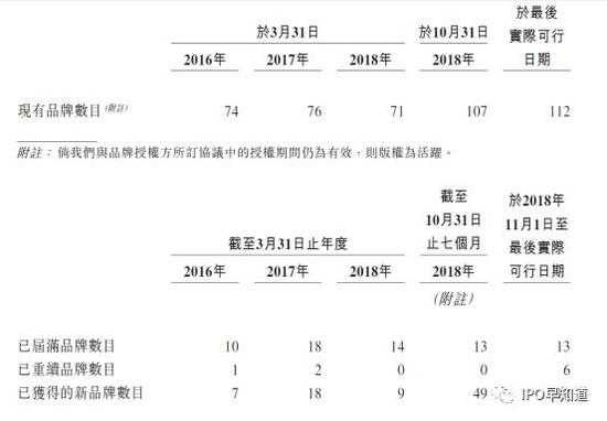 续约不力这一点在品牌授权这块业务中体现的同样明显。从2017年3月31日至2018年10月31日到期的总计27个品牌中,羚邦集团无一选择续约。而在2016年3月31日至2018年3月31日这段时间内,到期的品牌数量为42个,续约和新增的品牌数量总计也仅为37个。