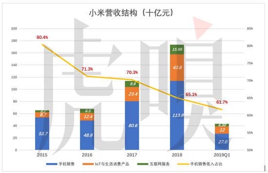 2019年Q1,小米三大主营业务收入分别为:手机270亿、IoT与生活消费产品12亿、互联网服务43亿。其中手机销售收入占营收的比值从2015年的80.4%降至2019年Q1的61.7%。