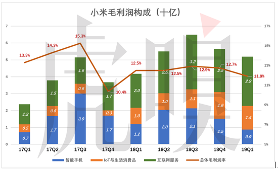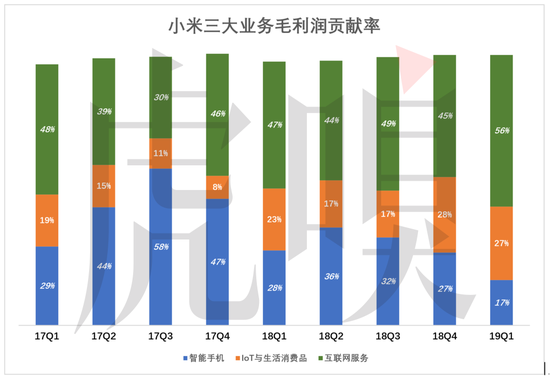 从各项业务对毛利润的贡献率看,小米的确不是一家卖手机的公司。2018年各季,互联网服务毛利润贡献在44%~49%之间,而智能手机业务毛利润贡献率在27%~36%之间。2019年Q1,智能手机的毛利润贡献率只有17%。
