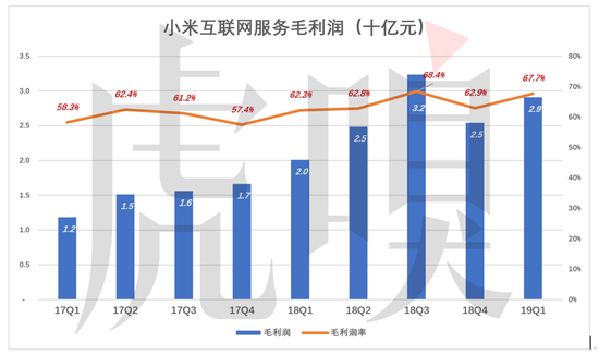 小米互联网服务毛利润率总体上高于60%。2017年Q4毛利润17亿,与智能手机业务持平。2019年Q1,互联网服务毛利润29亿,为智能手机的322%,毛利润率则为智能手机的21倍!