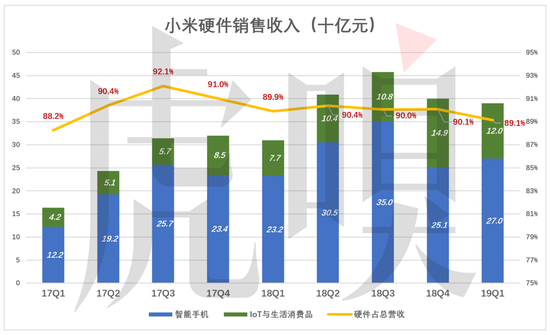 2019年Q1,小米智能手机、IoT生活消费产品销售收入合计为390亿,占总营收的89.1%。