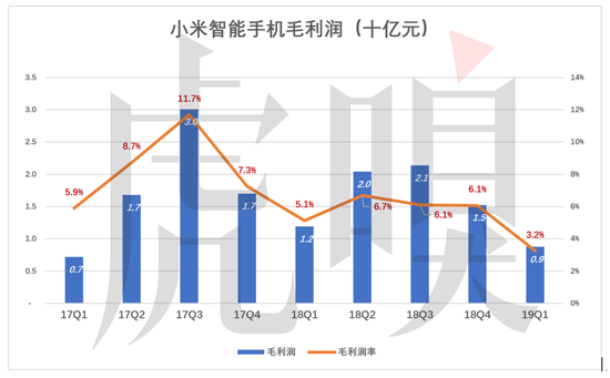 小米智能手机业务毛利润峰值出现在2017年Q3,达30亿,毛利润率11.7%。进入2018年,毛利润率再也没超过7%。2019年Q1,小米智能手机毛利润仅为9亿,毛利益率只有3.2%。