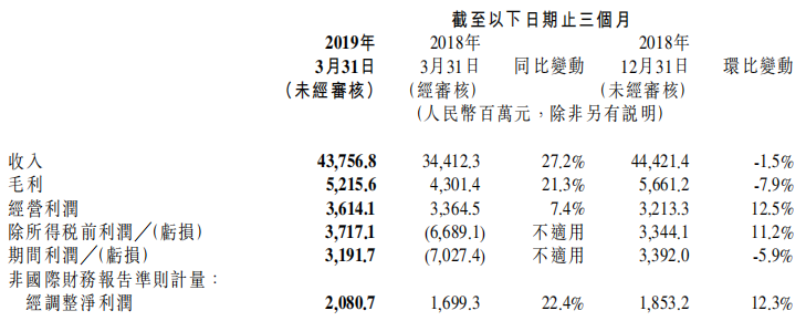 小米集团昨日盘后发布2019年一季报,总营收438亿人民币,同比增长27.2%,利润32亿人民币,同比由亏转盈,经调整净利润21亿元,同比增长22.4%,营收和利润均超市场预期。