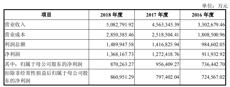 财务数据显示,2016年至2018年,公司实现营业收入330.26亿元、456.33亿元、508.27亿元;净利润分别是91.19亿元、127.24亿元、136.81亿元。