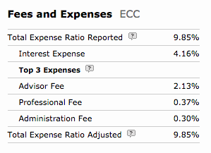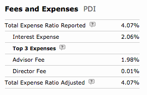 As you can see, the fees and expenses for the CEFs in my portfolio range from a low of 1.26% for PTY through the midpoint of 4.07% for PDI, up to the impressive high of 9.85% for ECC (Morningstar Category: Bank Loan). The remaining four funds fall between the low and midpoint.