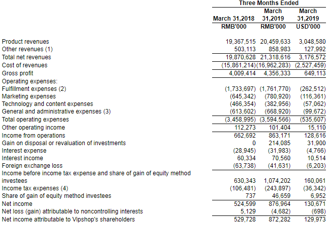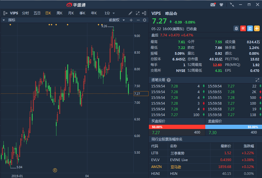 唯品会(VIPS)昨日美股盘后公布了未经审计的2019年第一季度财报,因业绩超预期,盘后一度大涨8%,当前涨6.47%。