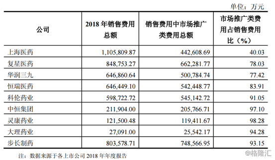 《问询函回复公告》中指出,公司销售费用中占比超过90%的市场、学术推广费及咨询费。其中2018年,公司市场活动费用支出31.24亿元,市场调研费用支出15.16亿元,学术活动费用支出17.87亿元,学术交流费用支出10.58亿元,其他费用9246万元。