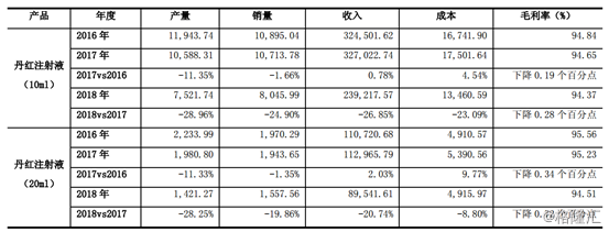 《问询函回复公告》中披露了丹红注射液近三年的销售情况,其中,2016年丹红注射液合计销售额43.52亿元,占当年营收123.31亿元的35.29%;2017年丹红注射液合计销售金额44.00亿元,占当年营收138.64亿元的31.74%;2018年丹红注射液合计销售额32.87亿元,占当年营收136.65亿元的24.05%。
