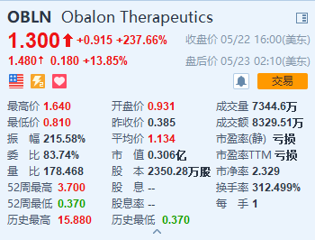 比日前在港股上市的中国稀土 来得更猛烈的是,美股一家卖减肥球囊的公司Obalon一夜之间暴涨237.66%,该股在盘中还一度涨超270%。截至美东时间5月23日收盘,该股报1.3美元,市值0.306亿美元。