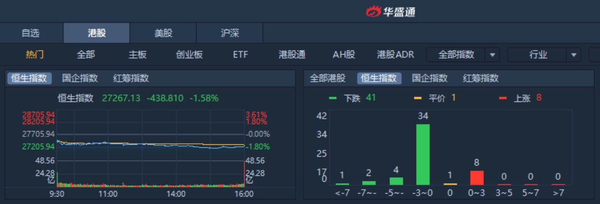截至收盘,恒生指数跌1.58%,报27267.13点,全日成交额达989.94亿。国企指数跌1.92%,报10401.11点,红筹指数跌1.09%,报4255.55点。