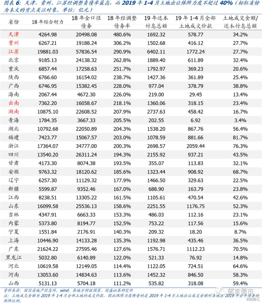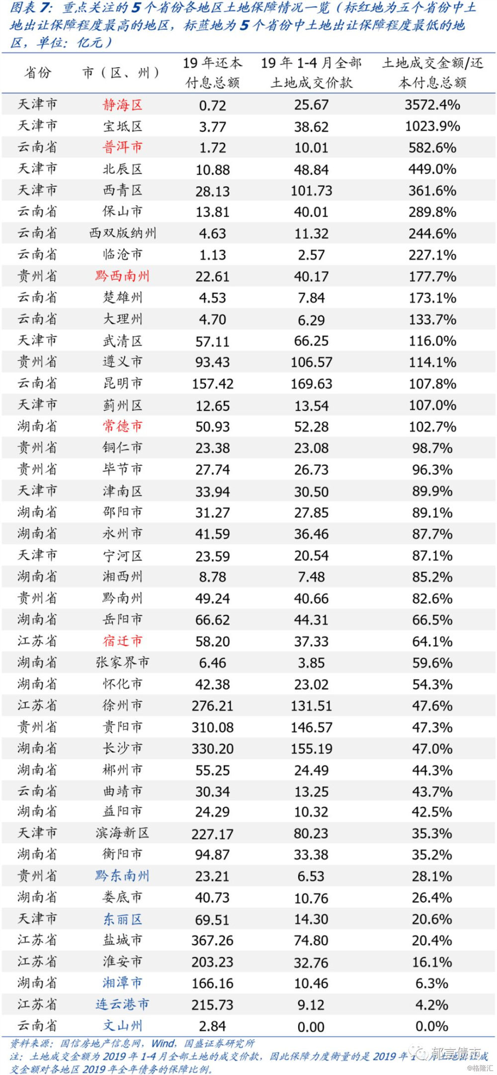 (5)土地出让对债务的保障力度=2019年1-4月各地的土地出让价款/19年还本付息总额