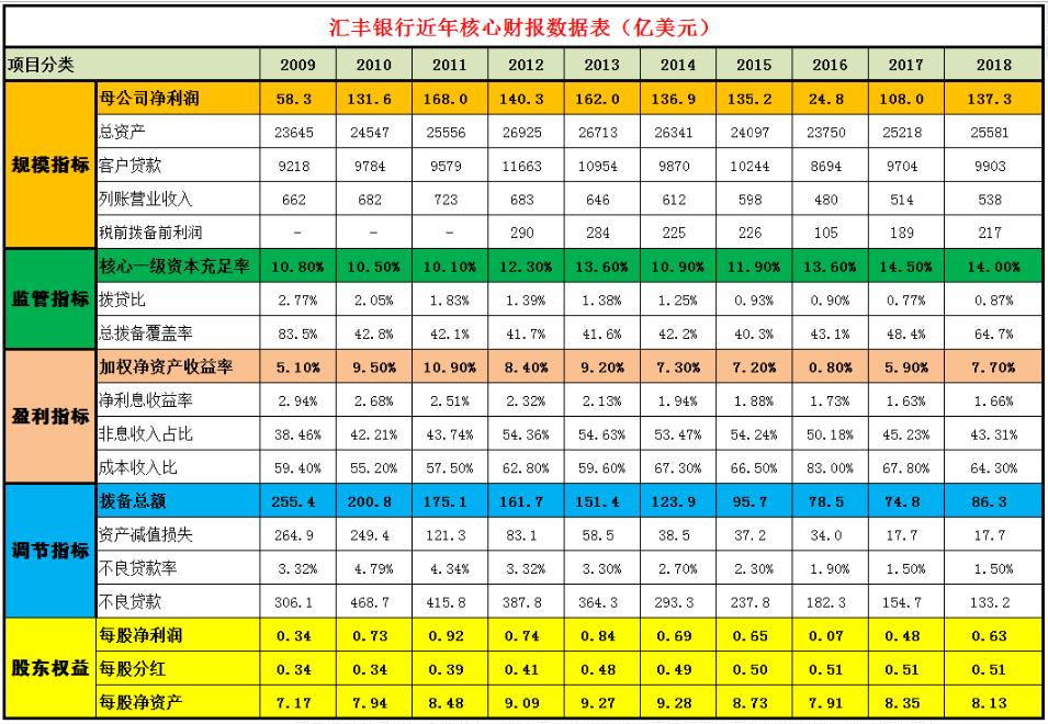 8、不良系列指标表现良好。2018年汇丰控股拨备总额86.25亿美元,同比为74.84亿美元;资产减值损失为17.67亿美元,和去年17.69亿美元持平,是净利润的13%。不良贷款余额为133.21亿美元,同比下降14%,不良贷款率为1.35%,去年同期为1.5%。从不良率和不良贷款总额来看,汇丰控股是双降的,且从2013年开始就一直双降,如果按照统一的口径算新生不良也是在逐年减少的,这说明汇丰控股的资产质量确实在好转。
