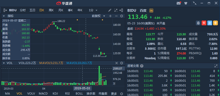受此影响,17日百度股价跳水式下跌,当日开盘130.53美元,前日收盘153.70美元,当日收盘128.31美元,比前日收盘价下跌16.52%。截止5月23日,收盘价为113.46美元,当日下跌4.17%。过去短短的一个礼拜,百度股价跌幅约30%。过去52周,百度股价最高为283.95美元,最低为113.30美元,跌幅约为60%。