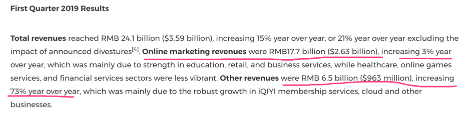 市场信心的丧失同时也体现在了之前的财报里面,百度盈利在环比上已经连续多季度下降,总营收方面环比下降超过11%,网络营销应收方面环比下降16.5%。百度收入核心的网络营销营收为177亿元(约合26.3亿美元),同比增长3%,占总营收73.4%;其他营收为65亿元(约合9.63亿美元),同比增长73%。另外,百度核心业务(Baidu Core)的营收为175亿元(约合26.0亿美元),同比增长8%。而上个季度,百度总营收为272亿元,网络营销营收为212亿元。