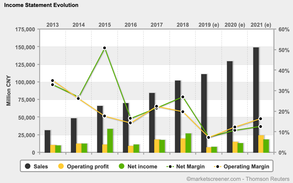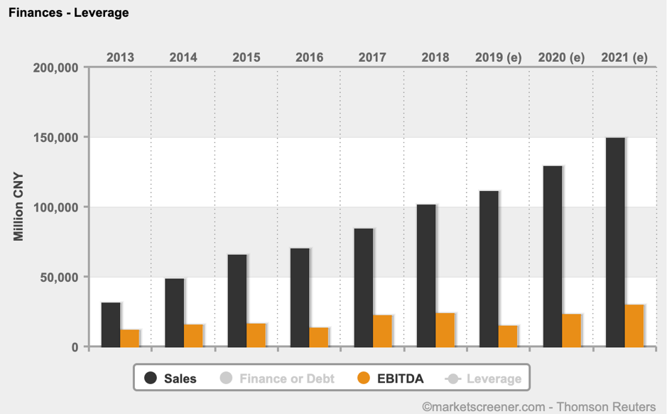 同时,在下图中的营业额不断上升的时候,该公司的EBITDA并未随之上升,而且可以从图中看到对以后的预测,该公司的营收能力并不能够随着营业额的上升而上升。由此可以预测到的是,其股价很难因为其营业额的上升而上升。