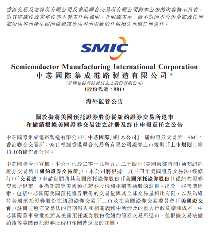 北京时间5月24日晚间消息,中芯国际(NYSE:SMI; SEHK: 981)今日宣布,已于美国东部时间2019年5月24日通知纽约证券交易所,中芯国际将根据修订后的1934年《美国证券交易法》,申请将公司的美国存托股(ADS)从纽约证券交易所自愿退市,并注销这些ADS和相关普通股的注册。