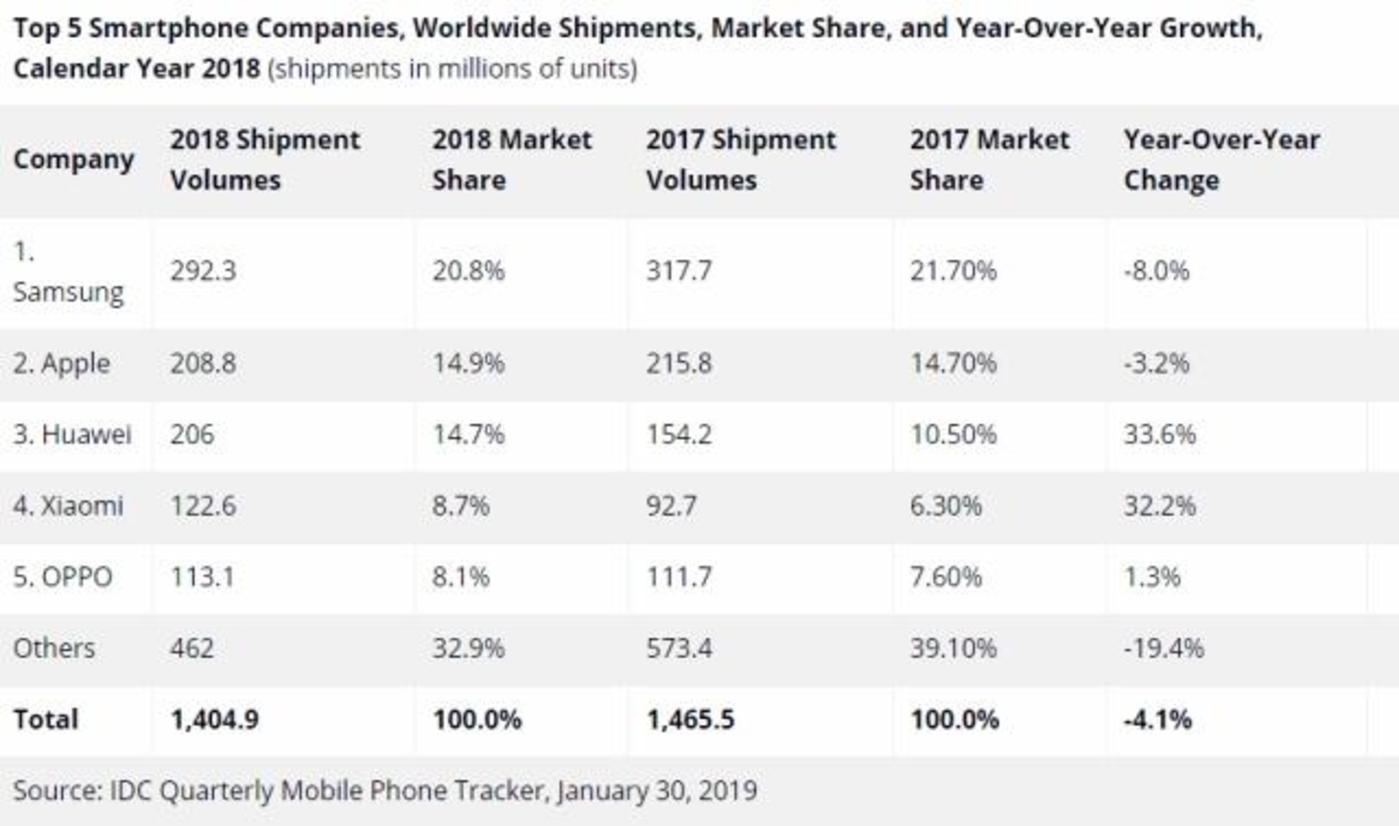 全球智能手机市场出货量的下滑早已成为现实,根据市场调研机构 IDC公布的2018 年全球智能手机市场出货量报告显示,2018 年第四季度全球智能手机出货量为 3.754 亿部,同比下降 4.9%,这已经是第五个季度出现同比下降的情况。就整年来看,2018 年总出货量为 14 亿部,比 2017 年减少了4.1%。