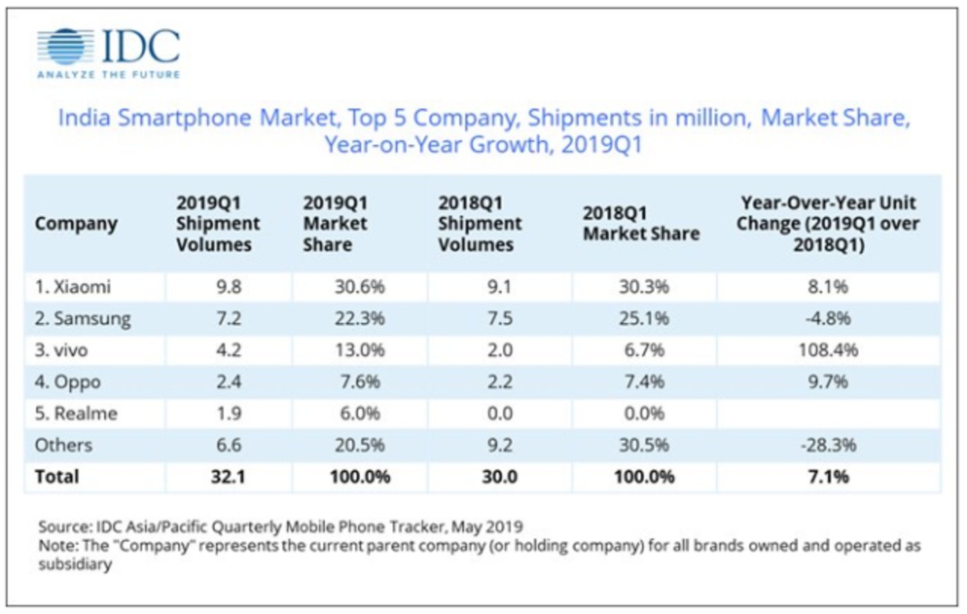 在传统主流市场不断下滑之际,印度这个拥有13亿人口的全球第二大智能手机市场却呈现出不断增长的趋势。根据IDC的一份报告显示,2018年印度智能手机市场出货量为1.423亿部,同比增长14.5%,达到历史最高水平;在2019年第一季度,印度国内智能手机市场依然保持着喜人的增长速度。IDC报告中显示,一季度印度智能手机市场出货量达到3210万部,同比增长7.1%。