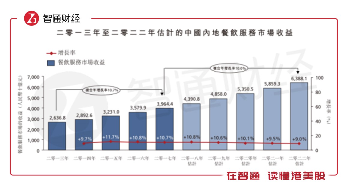 据弗若斯特沙利文预测,内地整体餐饮市场于2022年可达到人民币63881亿元,复合年增长率在2017-2022年间按10.0%的速度增长。相比之下,内地市场成长更快。
