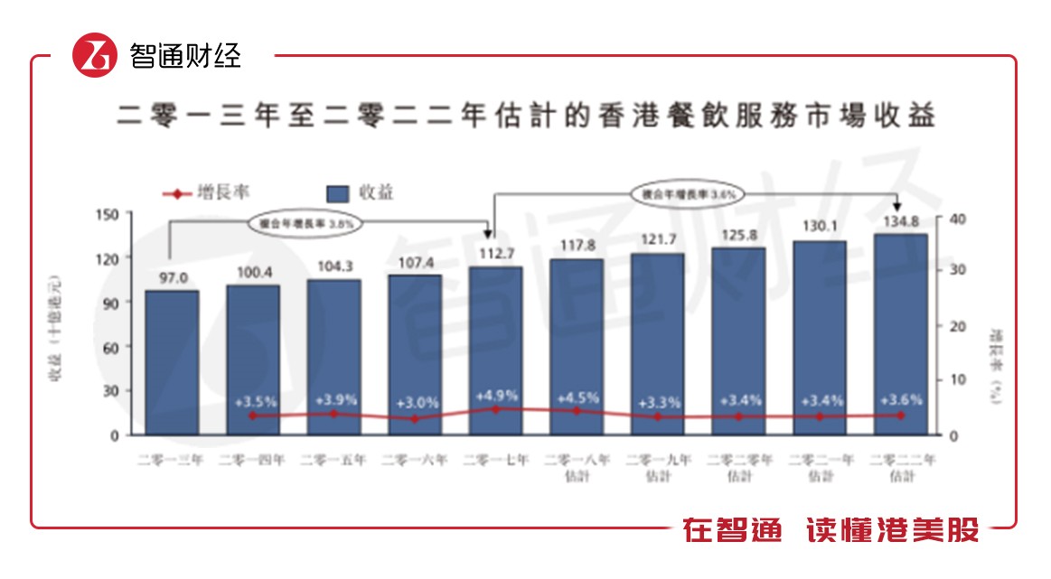 行业前景方面,智通财经APP了解到,随着旅游业进一步发展,人均可支配年收入持续增加及外出用餐偏好提升,香港餐饮服务市场收益预期将于2022年达到1348亿港元。其中,2017年-2022年间实现复合年增长率3.6%。