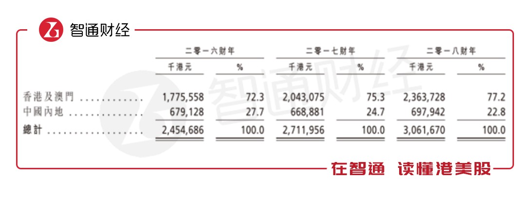在营收的地域分布方面,智通财经APP了解到,香港为公司收入来源的最主要地区,且营收占比正呈逐年扩大的趋势。截至2018财年,公司来自香港及澳门的收入占总收入的比重达77.2%。