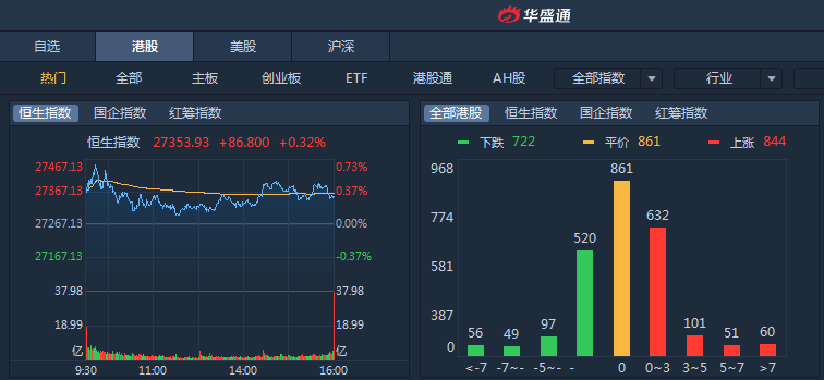 周五,恒指早盘高开,但全天仅维持窄幅震荡态势,量能较上一交易日大幅萎缩。截至收盘,恒生指数涨0.32%,报27353.93点,全日成交额达760.07亿。国企指数涨0.43%,报10445.54点,红筹指数涨0.41%,报4272.86点。