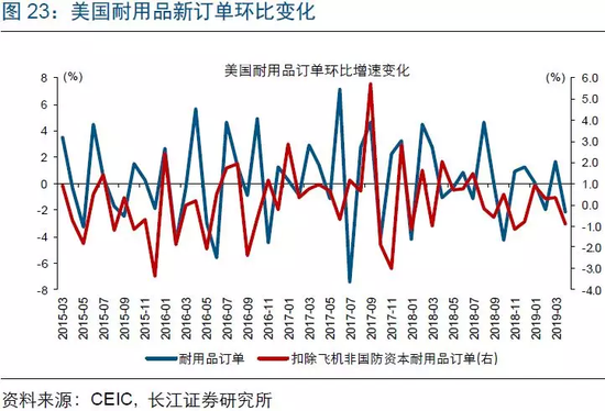 当周(5月20日-5月24日),美国公布4月耐用品新订单数据。其中,4月耐用品新订单环比下跌2.1%,低于预期的下跌2%和前值的增长1.7%;4月扣除飞机非国防资本耐用品新订单环比下跌0.9%,低于预期的下跌0.3%和前值的增长0.3%。