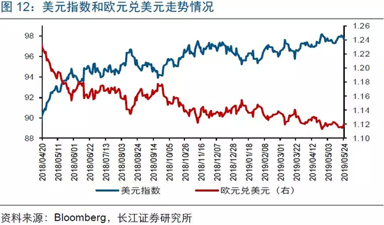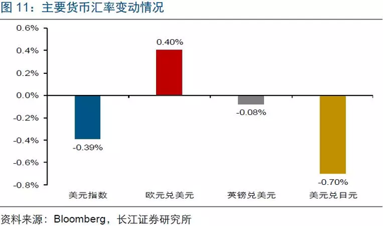 当周(5月20日-5月24日),美元上涨,英镑、欧元汇率下跌。受美国经济数据不及预期等影响,美元指数下跌0.39%至97.61;受英国首相May宣布辞职等影响,英镑兑美元汇率下跌0.08%至1.2714;伴随全球股市调整、避险情绪升温,日元升值,美元兑日元下跌0.7%至109.31。