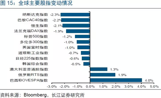 全球股市:发达股市普跌。美股道琼斯、标普500、纳斯达克分别下跌0.7%、1.2%、2.3%;其它股指方面,恒生指数下跌2.1%,巴黎CAC40指数下跌2.2%。