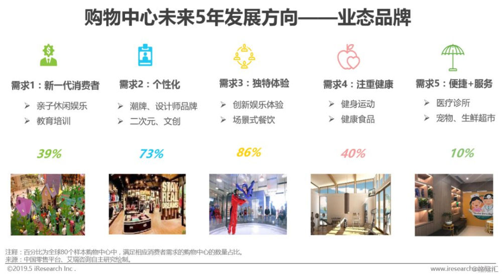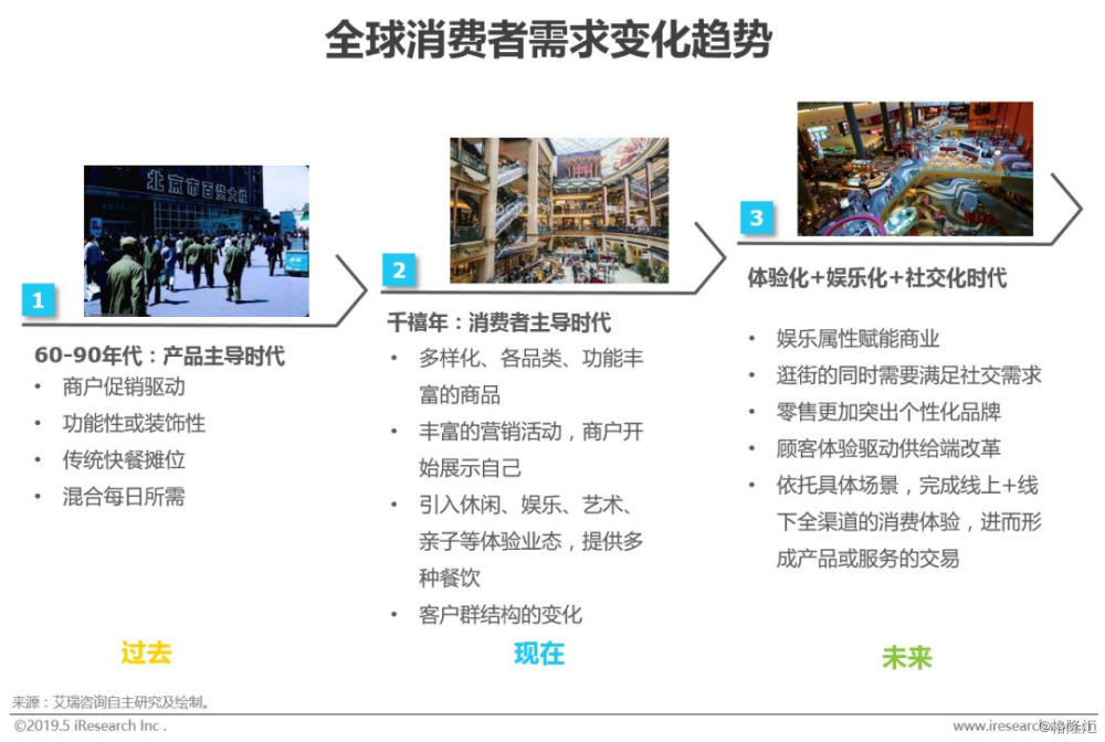 艾瑞通过对消费市场多年的洞察研究发现,购物中心已经从过去90年代的普通购物场所,转变为现在的千禧一代综合性购物场所。而未来购物中心将步入“体验化+娱乐化+社交化”的时代,购物并不会是其主要功能。在未来,购物中心将会依托具体消费场景,完成线上+线下全环节的消费体验业态的打造;逛街的同时购物中心需要满足社交需求,此外娱乐属性也将赋能商业;零售将更加突出个性化品牌,迎合不同个体定制化的需求。