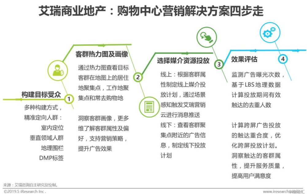 艾瑞自主研发的商业地理大数据服务产品OneZone通过以下四个步骤,打造购物中心闭环营销解决方案。