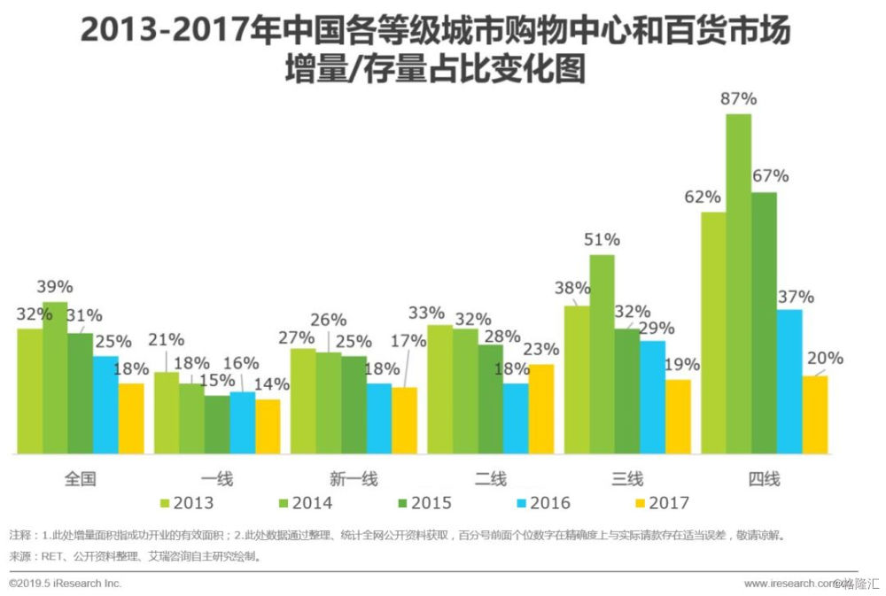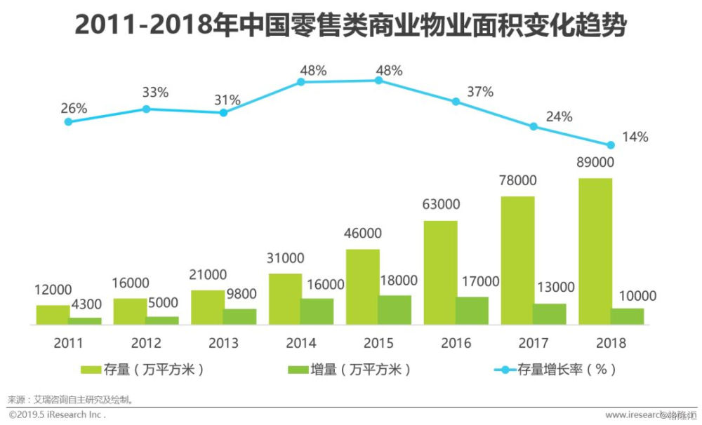 根据全网公开资料显示,自2008年金融危机以来,我国零售类商业面积以年均30%的高速增长率持续扩张,2015年存量达到顶峰,在这之后开始急剧下滑,购物中心市场开始逐步跨入存量时代,城市化发展红利消退,市场竞争趋于白热化。数据显示2018年购物中心存量规模已超5亿平方米。