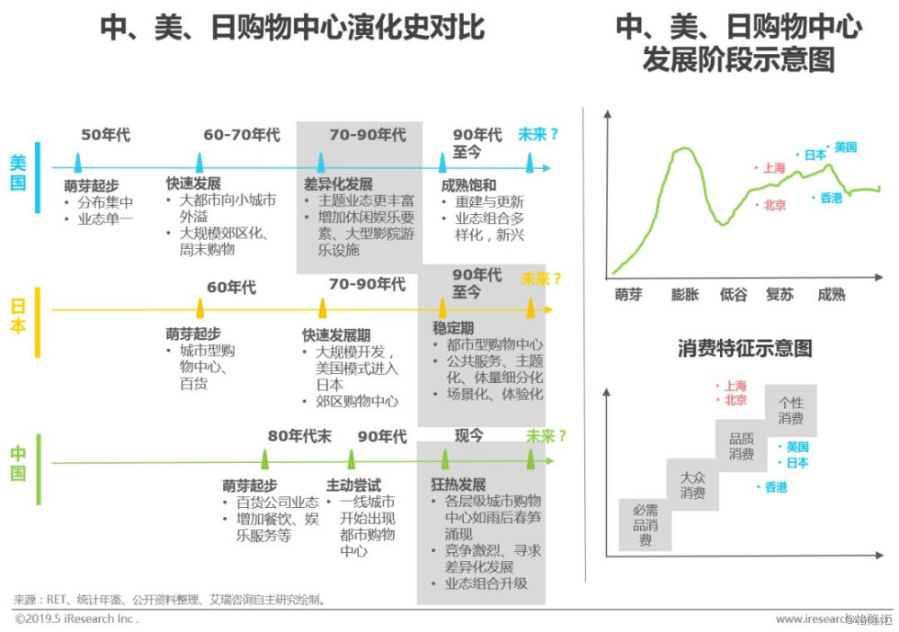美国是购物中心发源地,其发展历程对世界各国产生关键影响。现阶段美国购物中心市场步入成熟期且已饱和,购物中心正在更新存量,整合重建,引入新兴业态,进行多元创新化组合。日本购物中心市场步入成熟期且发展稳定,都市购物中心回归并进行体量细分,主题化、体验化、场景化是主要的发展点。中国购物中心市场步入复苏期,且发展迅速,品质消费、个性主题、业态品牌布局差异是主要的发展点。
