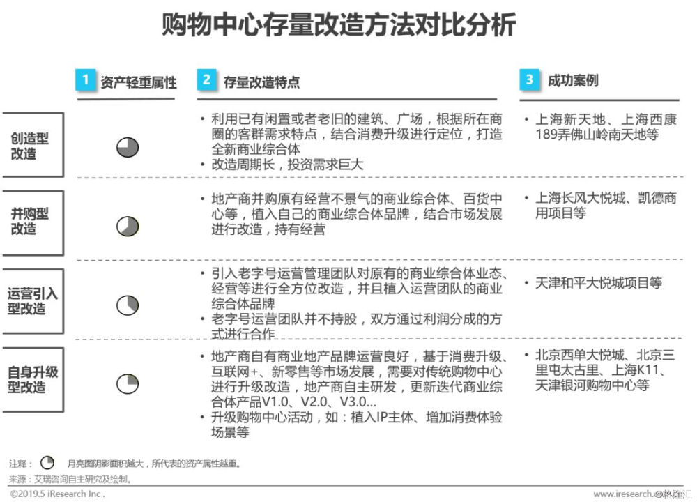 为适应新消费带来的挑战,全国各城市购物中心开始大规模改造升级,以保持对于主力客群的绝对优势。购物中心存量改造主要有以下4种方法,即:创造型改造、并购型改造、运营引入型改造、自身升级型改造。4种方法虽各有特点,但改造后的商业综合体均以消费者为核心,结合各自的品牌理念、市场消费升级方向、新零售的发展等要素,打造集体验、社交、娱乐、购物、休闲等多功能于一体的、多场景的消费场所。